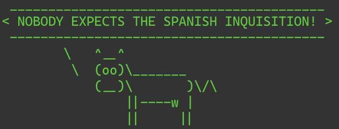 Having fun with the terminal #MontyPython#cowsay#fortunehttps://t.co/MPRC6A7UuE